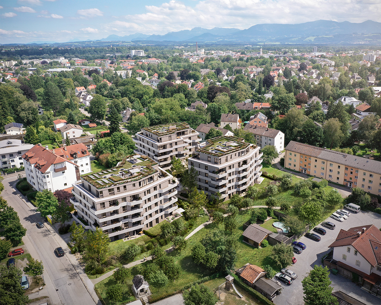 Zeitgeistiges Wohnen mit durchdachten offenen Grundrissen, voller Detailliebe und technischer Finesse, kombiniert mit innovativen Konzepten, einem mittig platzierten Spielplatz und einer nachhaltigen Installation von Photovoltaikanlage und Solarthermie auf den Gründächern.