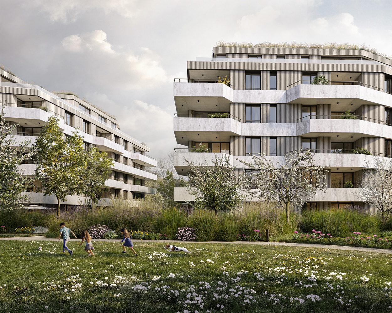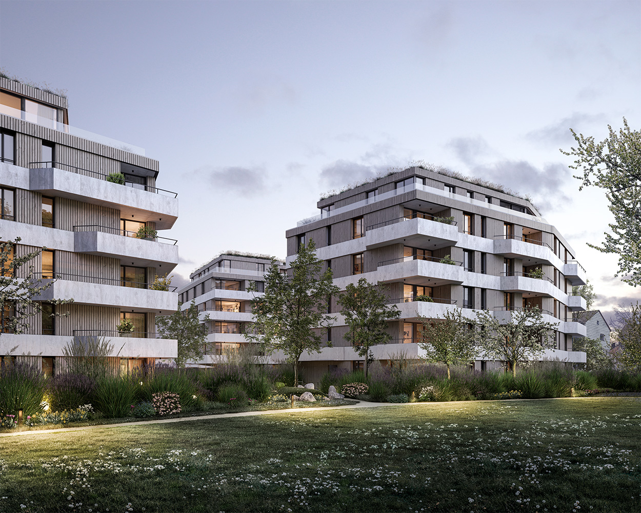In ökologisch urbaner Baukunst mit klarem, modernem Design, natürlichen Materialien und einer spielerischen Fassade, die luftige Freiräume eröffnet. Rückzugsmöglichkeiten bieten die privaten Gärten der Erdgeschoss-Wohnungen, die großzügigen Loggien, die sich über alle Stockwerke erstrecken oder die eigenen Dachgärten der exklusiven Penthäuser.