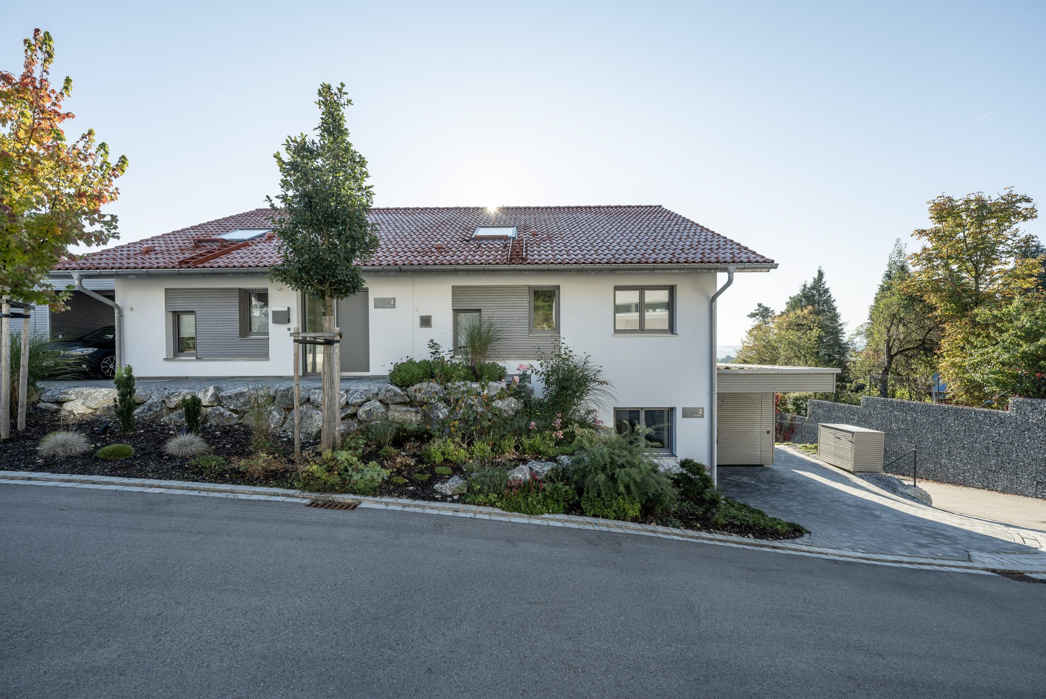 Dabei wird der Schlafbereich im Dachgeschoss vom Gäste- und Kinderbereich im Erdgeschoss durch die mittlere Wohnebene getrennt, verbunden durch kurze, platzsparende Treppenläufe. Auf diese Weise wird das Leben im Haus kommunikativ und effizient miteinander verknüpft, ohne auf die Privatsphäre zu verzichten. Neben den großzügigen Wohneinheiten und den Balkonen mit Bergblick, sorgen zweischalige Kommunwände für perfekten Schallschutz und die Realteilung für getrennte Entwässerung und ein gesichertes Gelände.